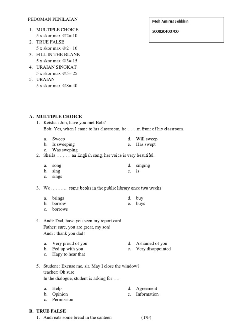 Namun, contoh contoh soal yang akan penulis share adalah contoh soal essai, multiple choice, dan true false khususnya contoh soal soal dalam pembelajaran bahasa inggris dan disertai dengan kunci jawabannya yang semoga nantinya dapat bermanfaat bagi kita semua. Ilm ki ahmiyat essay in urdu writing. Berikut informasi sepenuhnya tentang contoh soal true false bahasa indonesia. Bagaimana cara berlatih reading atau skill reading? Contoh soal true false bahasa inggris sma. In total, the plant has need of at least 16 elements, of which the most important are carbon, hydrogen, oxygen, nitrogen, phosphorus, sulfur, potassium, calcium, and magnesium. After her husband had gone to work, mrs. Contoh soal true false dalam bahasa inggris berbagi. Artikel contoh soal bahasa inggris kelas 7 tahun 2020 2021 smp mts lengkap dengan soal pg essay kurikulum pelajaran ibi semester 1 dan 2. Doc soal uts bahasa inggris smp kelas 8 semester genap ta 2017docx. Pilihlah huruf a b c atau d sebagai jawaban yang paling benar. Ide 36+ soal bahasa inggris true and false. Previous post contoh dan jawaban soal bahasa inggris sma lengkap terbaru (lct) next post cara membuat surat lamaran kerja dalam bahasa inggris ter up to date.